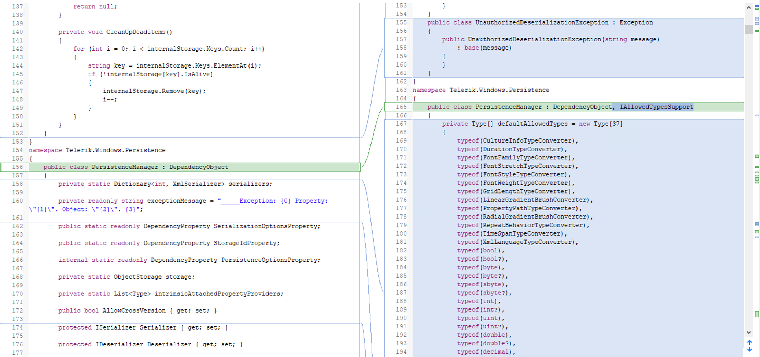 This functionality makes it clear why the framework is widely used—it enables seamless UI state persistence across application sessions. However, improper handling of serialized data can introduce serious security risks, such as insecure deserialization, which can be exploited to execute arbitrary code. To analyze the patch, I installed both the vulnerable and patched versions of Telerik UI for WPF. Based on the release note, I specifically decompiled the Telerik.Windows.PersistenceFramework.dll to examine its changes.